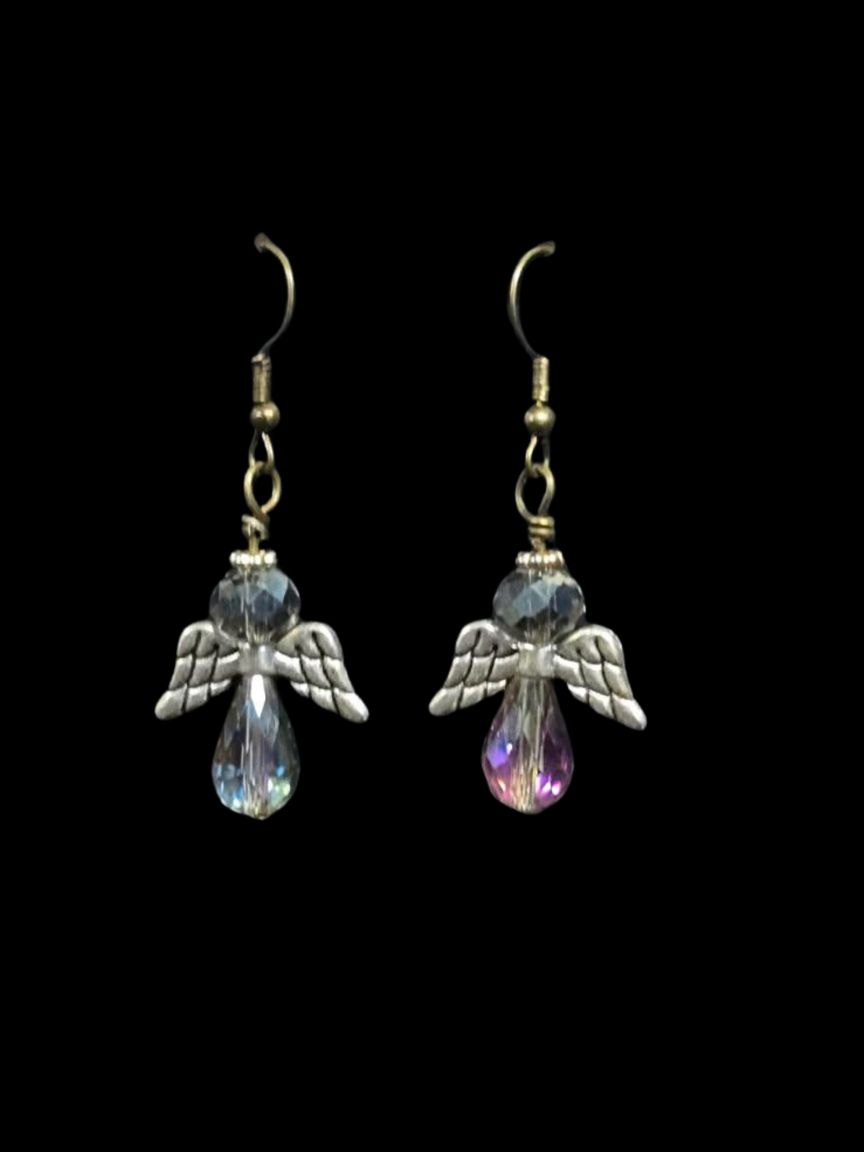 A pair of handcrafted dangle earrings shaped like delicate angels, featuring teardrop-shaped iridescent crystal beads as bodies and antique silver wings. Each earring is topped with a small round crystal bead and finished with bronze-tone hooks.