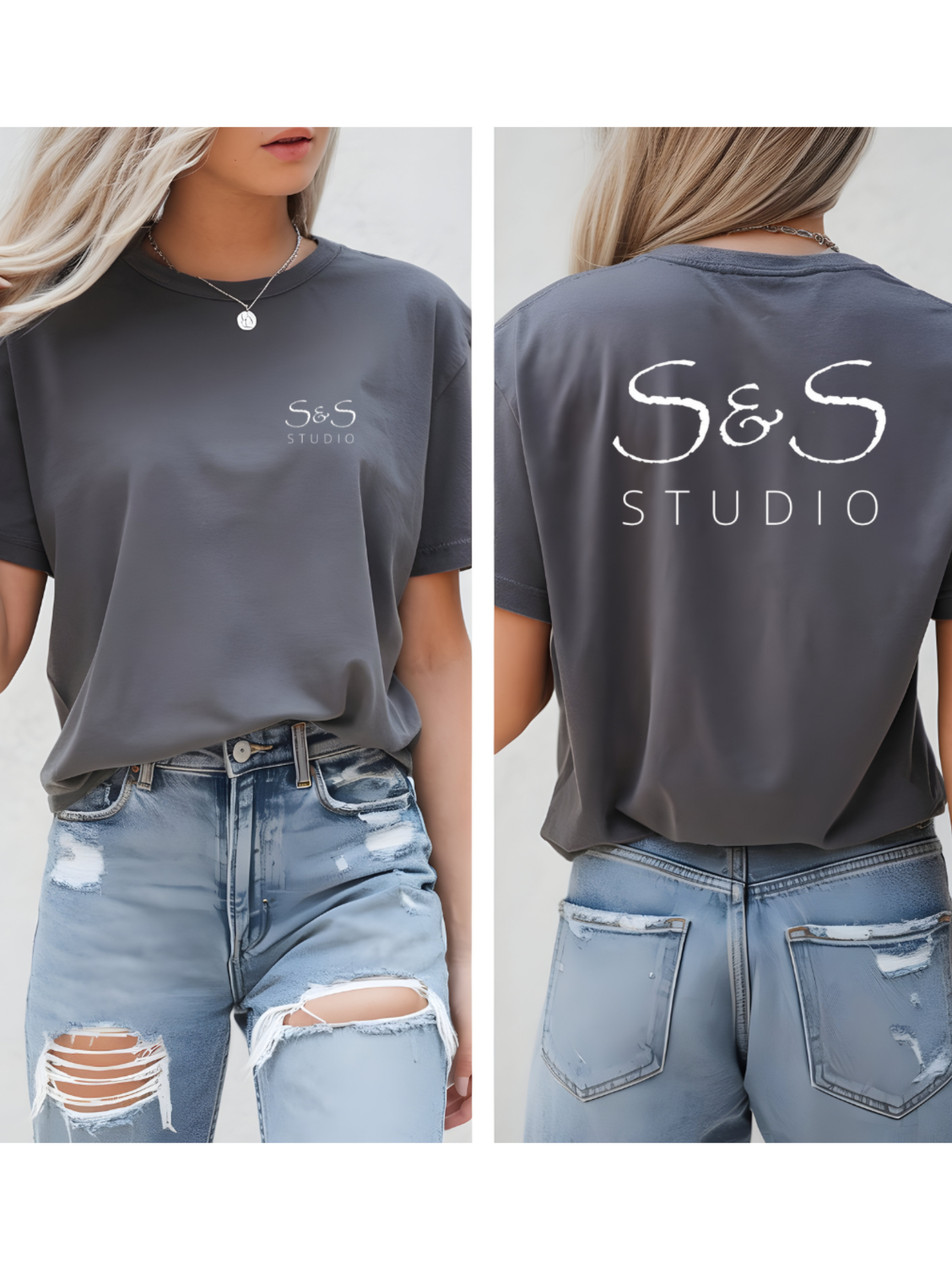 A relaxed-fit, t-shirt with the S&S Studio logo in white or black on the front left chest and a larger, hand-drawn S&S Studio logo on the back. The shirt is styled with light-wash, distressed jeans for a casual, nature-inspired look.